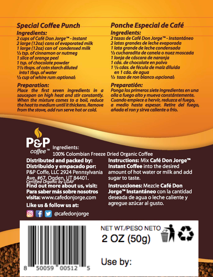 This is a 100% USDA Organic Colombian Freeze Dried coffee; Using 100% USDA Organic Arabica coffee, Café Don Jorge Instant Coffee is perfect when rushing, and you don't have the time to wait for your coffee to brew. It dissolves instantly in COLD or warm water or milk, which makes it perfect for iced coffee beverages. This is an excellent item to take on a camping trip and even one to have in your office desk. Ingredients: 100% USDA Organic Freeze Dried Coffee. Available in Regular and Organic.